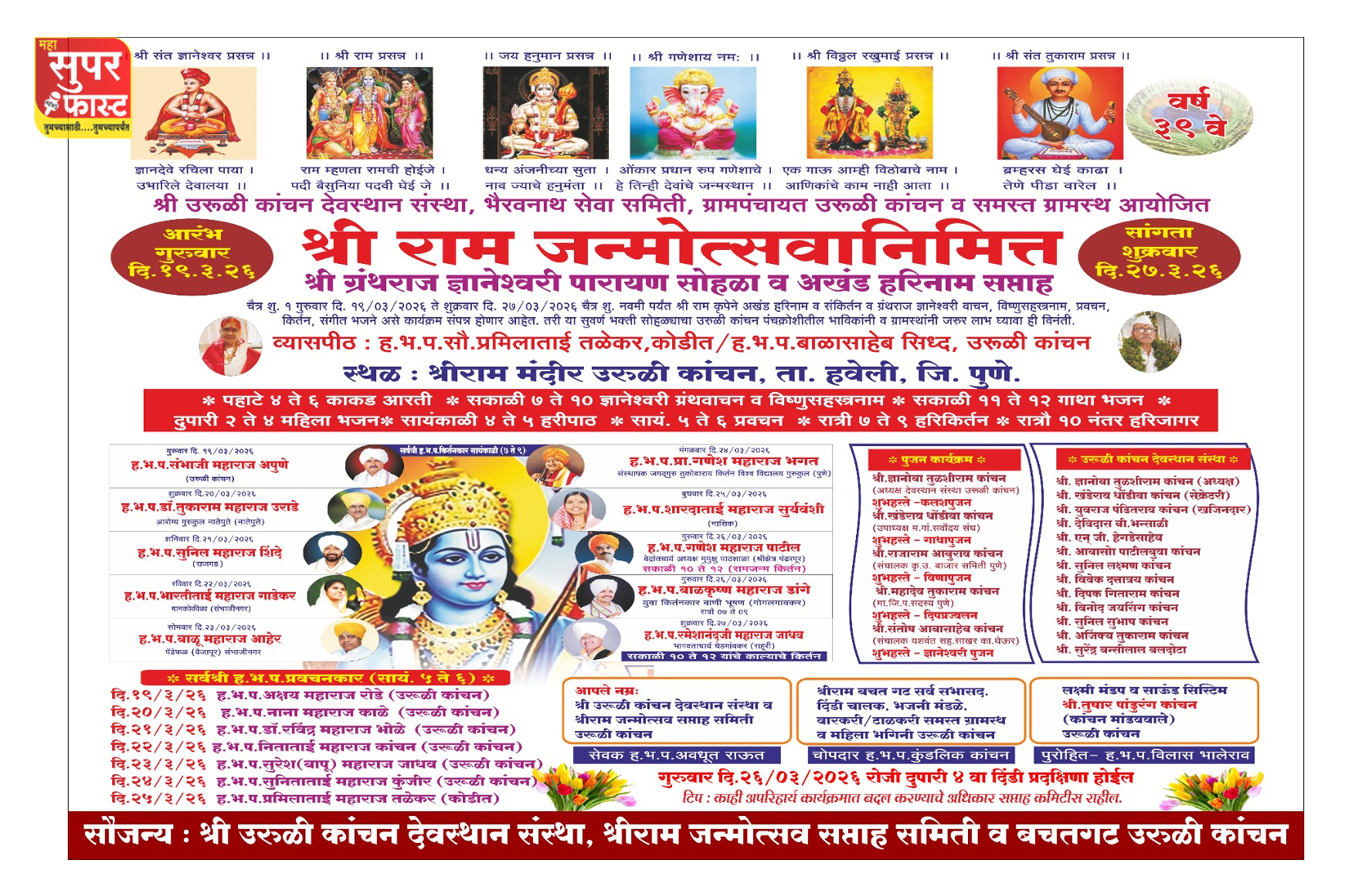 पुणे : श्रीराम जन्मोत्सवाच्या पावन निमित्ताने उरुळी कांचन नगरीत भक्तिभावाचा सागर उसळला असून, श्री ग्रंथराज ज्ञानेश्वरी अखंड पारायण सोहळा व अखंड हरिनाम सप्ताहाचा दिव्य सोहळा मोठ्या उत्साहात सुरू झाला आहे. उरुळी कांचन देवस्थान संस्था, भैरवनाथ सेवा समिती, ग्रामपंचायत तसेच समस्त ग्रामस्थांच्या संयुक्त विद्यमाने आयोजित हा आध्यात्मिक सोहळा येत्या शुक्रवार, दि. २७ मार्च २०२६ पर्यंत श्रीराम मंदिरात भक्तिभावाने पार पडणार आहे.