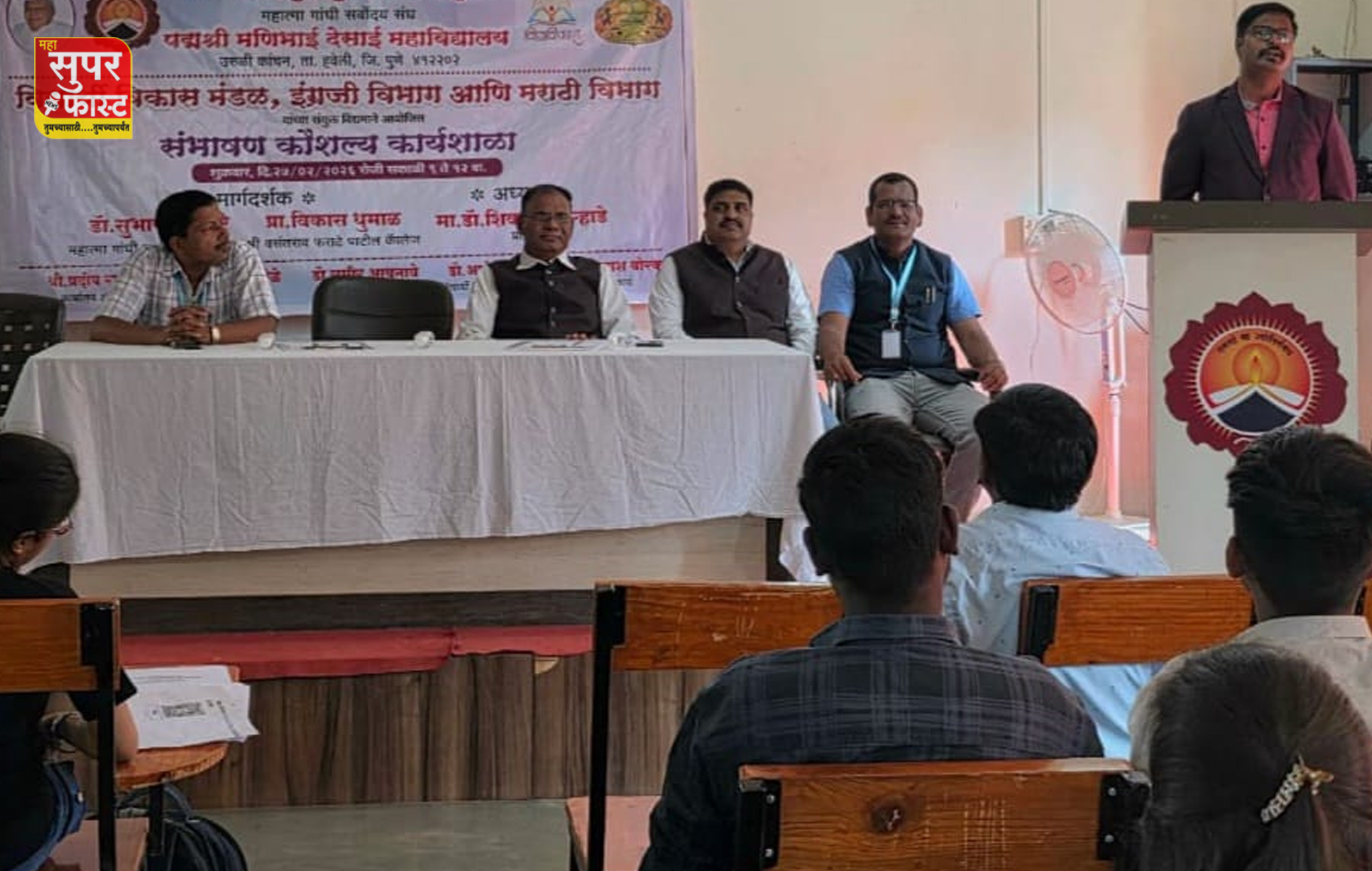 पुणे : येथील पद्मश्री मणिभाई देसाई महाविद्यालय (संचलित : महात्मा गांधी सर्वोदय संघ) येथे विद्यार्थी विकास मंडळ, मराठी विभाग व इंग्रजी विभाग यांच्या संयुक्त विद्यमाने सावित्रीबाई फुले पुणे विद्यापीठ पुरस्कृत संभाषण कौशल्य कार्यशाळा उत्साहात पार पडली. मराठी राजभाषा दिनाचे औचित्य साधून या कार्यशाळेचे आयोजन करण्यात आले होते.