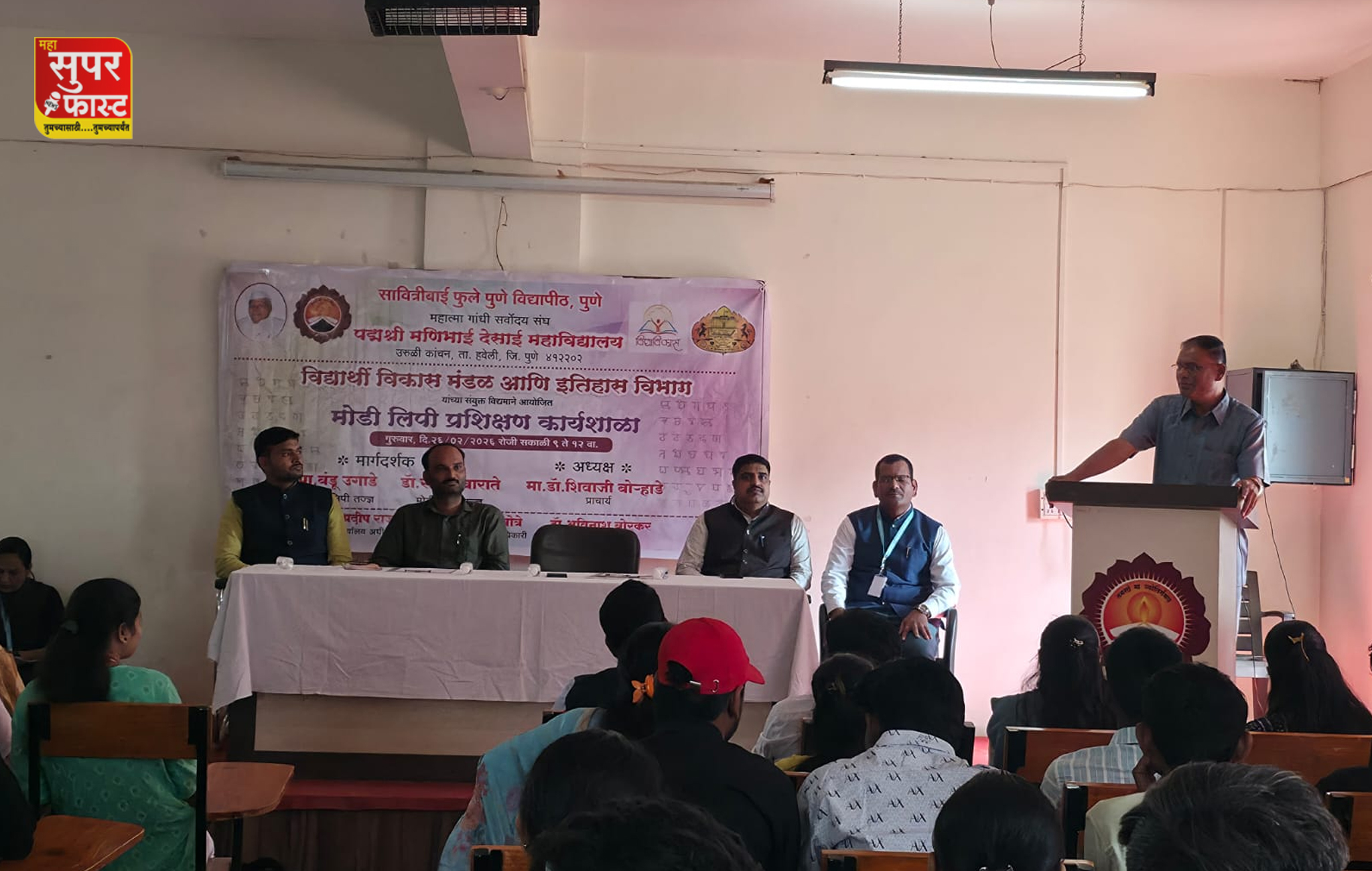 पुणे : उरुळी कांचन येथील पद्मश्री मणिभाई देसाई महाविद्यालयात विद्यार्थी विकास मंडळ व इतिहास विभाग यांच्या संयुक्त विद्यमाने सावित्रीबाई फुले पुणे विद्यापीठ पुरस्कृत मोडी लिपी प्रशिक्षण कार्यशाळा उत्साहपूर्ण वातावरणात पार पडली.