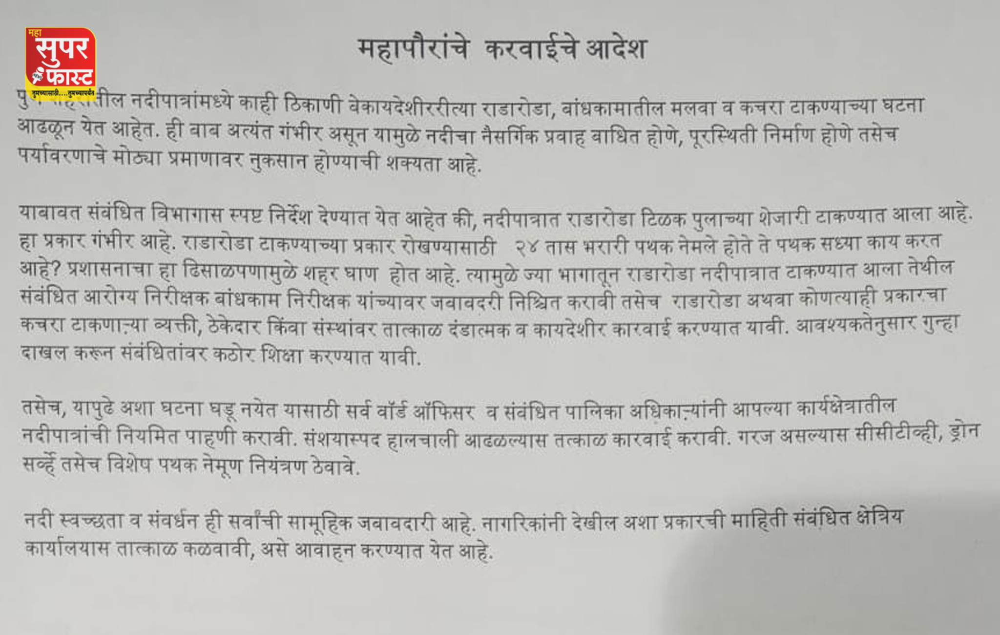 यापुढे अशा घटना घडू नयेत यासाठी सर्व वॉर्ड अधिकारी व संबंधित पालिका अधिकाऱ्यांनी आपल्या कार्यक्षेत्रातील नदीपात्रांची नियमित पाहणी करावी, असे निर्देश देण्यात आले आहेत. संशयास्पद हालचाली आढळल्यास तत्काळ कारवाई करावी. गरज असल्यास सीसीटीव्ही, ड्रोन सर्व्हे तसेच विशेष पथक नेमून नियंत्रण ठेवण्याचेही सुचविण्यात आले आहे.