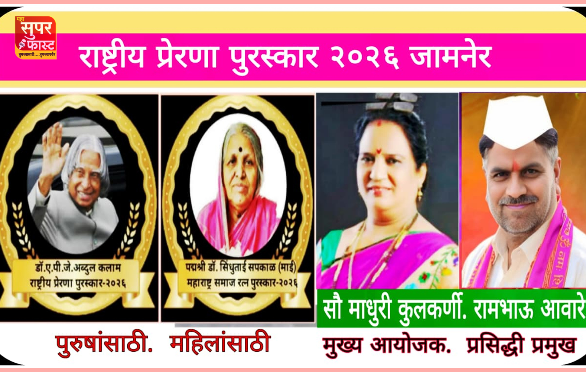 या पुरस्कार सोहळ्यात डॉ. ए.पी.जे. अब्दुल कलाम राष्ट्रीय प्रेरणा पुरस्कार–२०२६, पद्मश्री डॉ. सिंधुताई सपकाळ (माई) महाराष्ट्र समाज रत्न पुरस्कार–२०२६, तसेच समाज रत्न, समाज भूषण, आदर्श व्यक्तिमत्त्व, आदर्श ग्राम, जीवनगौरव व इतर विशेष कार्य सन्मान प्रदान करण्यात येणार आहेत. पुरस्काराचे स्वरूप सन्मानचिन्ह, सन्मानपत्र व पदक असे असणार आहे.