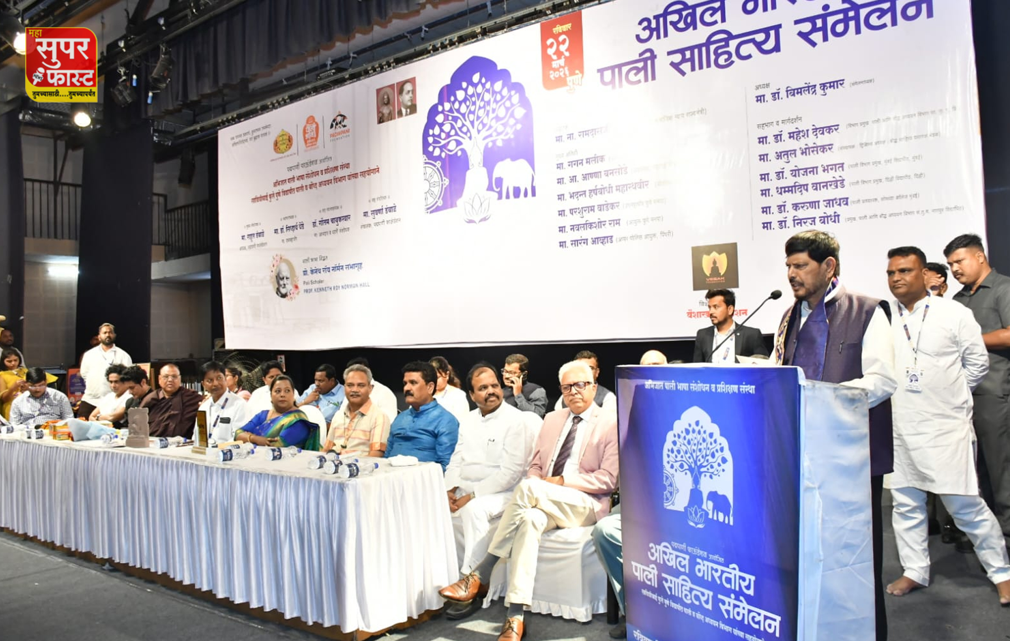 पद्मपाणी फाउंडेशन आणि सावित्रीबाई फुले पुणे विद्यापीठाचा पाली व बौद्ध अध्ययन विभाग यांच्या वतीने आयोजित करण्यात आलेल्या दुसऱ्या पाली साहित्य संमेलनाचे उद्घाटन आठवले यांच्या हस्ते करण्यात आले. यावेळी संमेलनाध्यक्ष बनारस हिंदू विश्वविद्यालयाच्या पाली विभागाचे प्रमुख प्रा. डॉ. बिमलेन्द्र कुमार, गगन मलिक, भदंत हर्षबोधि महाथेरो, डॉ योजना भगत, उपमहापौर परशुराम वाडेकर, धम्मदीप वानखेडे, डॉ. करुणा जाधव, डॉ नीरज बोधी, सारंग आव्हाड, स्वागताध्यक्ष डॉ सिद्धार्थ धेंडे, डॉ. गौतम चाबुकस्वार, संयोजक राहुल डंबाळे, सुवर्णा डंबाळे, आरपीआयचे प्रदेशाध्यक्ष राजाभाऊ सरवदे आदी मान्यवर उपस्थित होते.